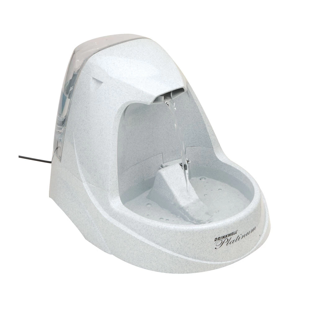 La fontaine possède un filtre à charbon (qui peut être remplacé) qui élimine le goût et les mauvaises odeurs. Elle est également dotée d’un pré-filtre qui capte les poils et autres particules avant qu’ils n’atteignent le moteur. La rampe existante réduit les éclaboussures dûes à l’écoulement de l’eau.