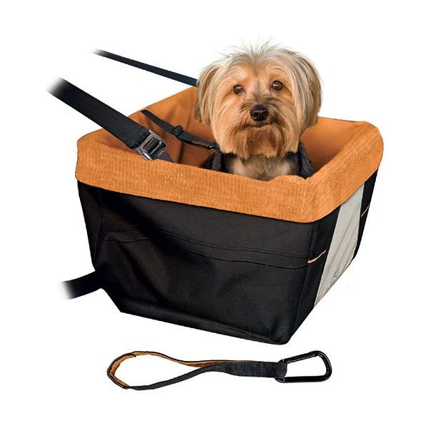 Une sangle réglable fixée à l’intérieur du siège, permet d’attacher le chien grâce à un mousqueton qui se fixe facilement sur le harnais.