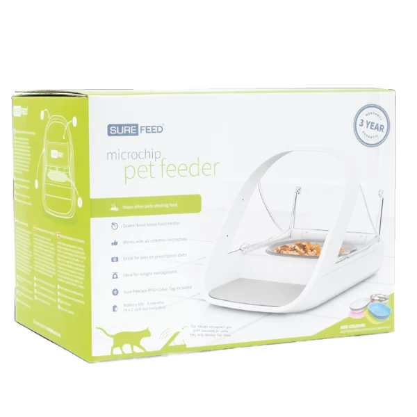 SUREFEED est un distributeur de nourriture connecté et innovant, qui fonctionne la puce électronique ou le médaillon d’identification (par radiofréquence) de votre animal de compagnie.