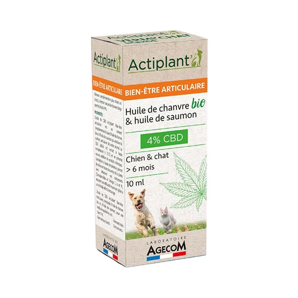 ActiPlant’ Bien-Être Articulaire 4% est un complément alimentaire pour chien et chat à base d’huile de chanvre et d’huile de saumon.