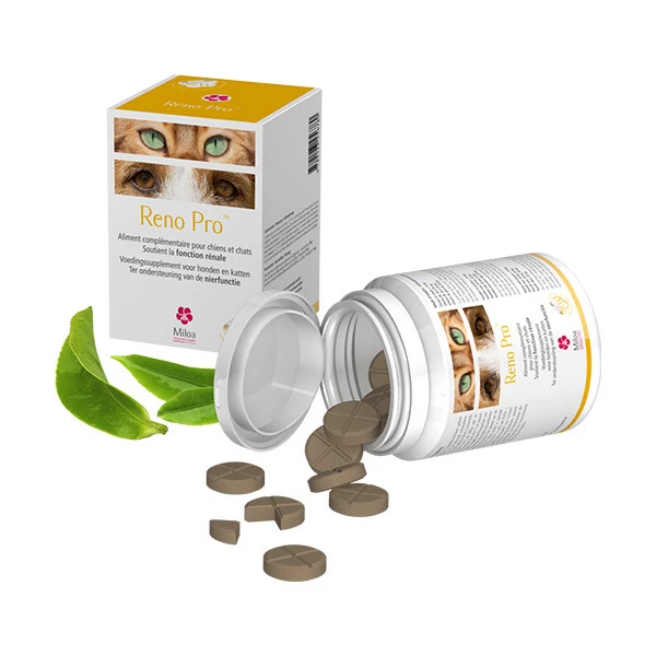 L’ensemble des composants nutritionnels de Miloa Reno Pro agit en synergie pour le soutien de la fonction rénale. Reno Pro est pauvre en phosphore.